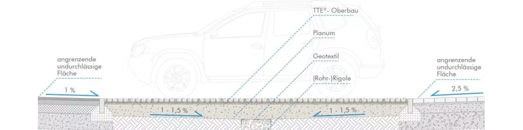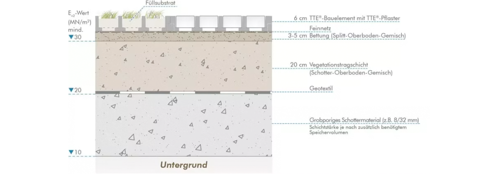 Die TTE®-Bauweise stellt geringe Anforderungen an die Verdichtung des Untergrundes woraus i.d.R. eine hohe Versickerungsleistung der Fläche resultiert. Es eignet sich deshalb im Gegensatz zu herkömmlichen versickerungsfähigen Befestigungen ideal zur effizienten Regenwasserbewirtschaftung in Österreich. So können dezentrale Versickerungsanlagen mit breitflächiger und oberflächennaher Versickerung hergestellt werden, die befahrbar sind und somit keine zusätzlichen Flächen in Anspruch nehmen. Durch die Integration einer belebten Bodenzone wird eine flächendeckende Vorbehandlung von belasteten Niederschlägen und Niederschlagsabflüssen durch biologische Abbauprozesse gewährleistet. Je nach Belastung und Bauweise sowie der Versickerungsfähigkeit des jeweiligen Untergrundes stehen unterschiedliche Versickerungslösungen zur Verfügung.